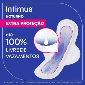 Absorvente Intimus Noturno Extra Proteção com Abas Cobertura Seca O Absorvente Intimus Noturno Extra Proteção absorve instantaneamente o fluxo intenso, devido a sua dupla área de absorção, no centro e