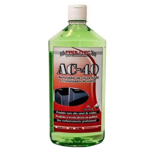 O AC40 PROLITEC REMOVEDOR DE CHUVA ÁCIDA foi especialmente desenvolvido para devolver a transparência dos vidros automotivos. O produto remove marcas causadas pela água, principalmente as que contém cálcio e magnésio,
