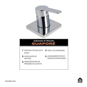 O Acabamento de Misturador Monocomando Guaporé Pingoo.casa combina sofisticação e funcionalidade por ser produzido em Aço 201 e Zinco de excelente qualidade, oferecendo fácil instalação, resistência à corrosão e longa durabilidade.