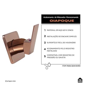 O Acabamento de Misturador Oiapoque Pingoo.casa combina sofisticação e funcionalidade por ser produzido em Aço 201 e Zinco de excelente qualidade, oferecendo fácil instalação, resistência à corrosão e longa durabilidade.