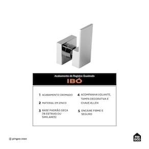 O Acabamento de Registro Quadrado Ibó Pingoo.casa une praticidade e estilo para valorizar o design do banheiro. Produzido em zinco de excelente qualidade, oferece resistência e durabilidade no uso diário, garantindo um acabamento sofisticado e moderno ao ambiente.