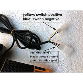Cabo vermelho: Acelerador +5V Cabo preto: Terra do acelerador Cabo verde: Sinal do acelerador Cabo amarelo: Posição positiva da chave Cabo azul: Posição negativa da chave Conteúdo da Embalagem: 1 par (Acelerador + Manoplas + Chave de Ignição)