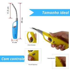 Acendedor a gás multiuso com bico flexível e recarregável. Possui gatilho de ignição, fecho de segurança e regulador de chama.Tipo