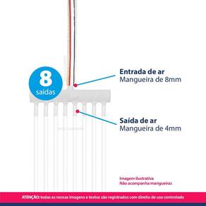Características: Distribui o ar igualmente para 8 saídas Entrada de ar de 8mm Saídas de ar de 4mm Plástico resistente Fácil instalação