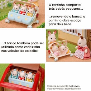 Acessório - Sylvanian Families - Carrinho Trigêmeos - Epoch Magia: Sylvanian Families são adoráveis personagens animais distintos com charmosas e bonitas casas, móveis e acessórios. Eles vivem, trabalham e brincam na idílica e maravilhosa terra de Sylvania. Detalhes: • O Carrinho para Trigêmeos (bebês pequenos) é um carrinho para figuras de bebês trigêmeos • Ao remover o assento, você pode abrir espaço para um par de gêmeos • O assento também pode ser utilizado como assento infantil em um carro da coleção (vendido separadamente) Informações: • Produto: Carrinho de Bebê Trigêmeos • Marca: Epoch Magia • Coleção: Sylvanian Families • Tipo: Carrinho de Bebê para Figuras • Categoria: Figuras de Animais e Pets • Conteúdo: 04 peças - 01 Carrinho de bebê - 01 capota - 01 assento - 01 capa de assento • Recomendação: para crianças a partir de 03 anos de idade Especificações: • Referência: 5533 • Código de Barras: 5054131055335 • Embalagem (C x A x L): 08 x 14.5 x 06 cm • Embalagem (Peso): 0.076 kg • Material / Composição: Plástico Injetado e Tecido • Registro: 004534/2019 • Certificado: Órgãos Autorizados - OCP´S (Organismos de Certificação de Produtos) Aviso: • As imagens são meramente ilustrativas • Os pesos, tamanhos e medidas são aproximados • As cores e estampas dos produtos podem ter variações • As informações são de responsabilidade do fabricante ou fornecedor