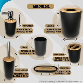 Acessórios para banheiro com 6 peças de estilo contemporâneo envio relâmpago Kit de banheiro 6 peças Mantenha sua casa organizada e limpa com o conjunto de 6 peças. Com um design elegante na cor preto ou branca, é ideal para quem busca praticidade e eficiência. Compacto e funcional, eles se adaptam perfeitamente a diferentes ambientes, seja na cozinha, escritório ou área externa. A qualidade e a resistência do material garantem durabilidade e uso prolongado. Enviada cor disponivel em Conteúdo da embalagem 6 x peças para banheiro Enviada cor disponivel em Características Cor: preto ou branca Número da peça: 6 peças Número de unidades: 6 Enviada cor disponivel em Especificações Dimensões da embalagem: 27,5 x 20 x 20 cm Dimensões do pacote: 27.5 x 20 x 20 centímetros Enviada cor disponivel em Não perca a chance de manter sua casa em ordem adquira agora o conjunto banheiro 6 peças e traga mais organização e estilo para o seu dia a dia Marca: Não Informado