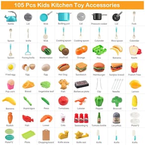 Deixe seus filhos brincarem, aprenderem e se divertirem com os acessórios de cozinha Zero Zoo Pretend Play Toy! Brincar de fingir é a maneira perfeita de fazer com que seus filhos usem sua criatividade e os ensinem sobre diferentes utensílios, alimentos, cores, etc., mantendo-os entretidos e engajados. Ao imitar atividades da vida real, nosso conjunto de utensílios de cozinha e brinquedos de cozinha inspirará a imaginação de seu filho; incentive a interação social e ajude a criar uma base sólida para o futuro, garantindo que eles se divirtam! Conjunto de brinquedos de cozinha de design exclusivo Design Zero Zoo, conjunto de churrasco, conjunto de fast food, garrafas de especiarias, brinquedos, óleo, molho, comida cortável, comida enlatada e outros conjuntos de cozinha para crianças. Ajude as crianças a fingirem brincar de utensílios de cozinha e permita que elas se imaginem em novos papéis e criem cenários emocionantes. Vários utensílios de cozinha Escolha entre 105 peças de brinquedos e acessórios de cozinha infantis realistas! Permite que os jovens desenvolvam habilidades motoras e aprendam sobre a cozinha de forma segura e divertida. Durável e fácil de limpar Feito de plástico ABS não tóxico e durável. As bordas de cada peça são lisas, o que é adequado para crianças. Fácil de limpar. Brinquedos educativos de aprendizagem É melhor do que a TV e mais envolvente do que os livros! Permita que as crianças sejam criativas e mergulhem em sua imaginação, alimentadas por utensílios de cozinha interativos e brinquedos gastronômicos. O conjunto de utensílios de cozinha para crianças inclui 105 peças de acessórios: conjunto de utensílios de cozinha: panela de pressão, panela de sopa, frigideira, chaleira, tampa de panela Conjunto de utensílios de cozinha: peneira de macarrão, picador de pizza, peneira, espátula angular, espátula, colher Conjunto de churrasco: forno, clipe, palito de churrasco, comida rápida: hambúrguer, bebida, batata frita, pipoca, waffle, sanduíche duíche, cachorro-quente Outros alimentos: ovo frito, ovo, pimenta verde, tomate Utensílios de mesa: faca de mesa, garfo, colher, prato, tigelas Outros acessórios de cozinha: tempero, faca -?Brinquedo completo para cozinhar e churrasco Conjunto?Cada conjunto de cozinha vem com 105 peças de brinquedos de cozinha fingidos divertidos e envolventes, inclui conjuntos de panelas e frigideiras, chaleira, tigelas, pratos, pauzinhos, utensílios de cozinha de brinquedo, conjunto de churrasco, conjunto de facas, alimentos e vegetais enlatados, conjunto de fast food e muito mais para proporcionar horas infinitas de diversão -?Torne o aprendizado infinito divertido?Nosso conjunto de brinquedos de cozinha fingida incentiva seus filhos a usarem a imaginação e criatividade enquanto os ensina sobre diferentes utensílios de cozinha, cores e alimentos e ajuda a promover o reconhecimento de cores, a coordenação olho-mão, aprendizado inteligente e aprenda mais sobre culinária. Perfeitos para cozinhar, fingir e interpretar papéis de chefs -?Material seguro e resistente?Nossos conjuntos de utensílios de cozinha de brinquedo para cozinha foram feitos de materiais ABS, são resistentes a quedas, fáceis de limpar, sem BPA ou materiais agressivos, para garantir que sejam seguros e resistentes para as brincadeiras diárias. Nosso conjunto de facas não é fácil de quebrar, pois é seguro e feito para lidar com o espaço diário de crianças -?Conjunto de brinquedos de cozinha realista e comida cortável?O conjunto de cozinha realista incentiva a imaginação, destreza e brincadeiras criativas. Ensina seus filhos a serem os pequenos ajudantes da mãe. A chaleira pode ser enchida com água e o bico pode ser retirado. Dê ao seu filho um presente que cria inúmeros momentos felizes! -?Garantia de satisfação?Presente infantil perfeito para aniversários, feriados, Natal, Ano Novo, Ação de Graças, Páscoa e qualquer outra ocasião. Proporcionar uma experiência de 100% de satisfação é nossa principal prioridade para nossos clientes. Sinta-se à vontade para nos enviar uma mensagem por meio de “ com os vendedores” se os produtos não atenderem às suas expectativas. As comemorações começam no Zero Zoo!