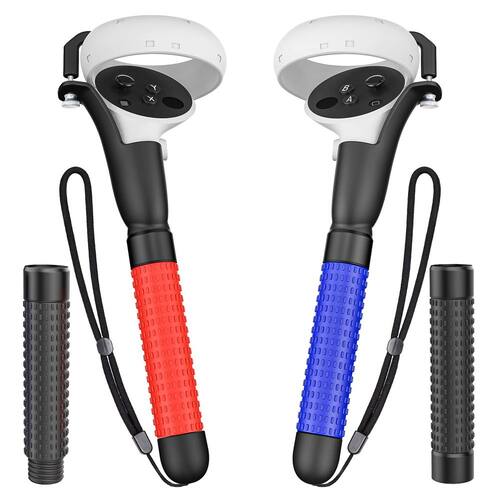 Acessórios HUIUKE VR Game Handle para controladores Quest 2, alças de extensão para jogar Beat Saber Gorilla Tag Long Arms, acessórios de alça VR compatíveis com jogos de realidade virtual -?Experiência aprimorada de jogo em realidade virtual?As alças estendidas de jogos de realidade virtual projetadas especificamente para controladores quest, quest 2 ou rift s jogarem uma série de jogos de realidade virtual permitem que você tenha uma sensação envolvente de segurar o jogo, tornando o jogo mais realista e interessante. -?Adequado para vários jogos de realidade virtual?De acordo com as necessidades do jogo, pode ser dividido em três tipos diferentes de alça de extensão de jogo, tanto para adultos quanto para crianças. Projetado especialmente para Gorilla Tag, Beat Saber, Supernatural, adequado para jogos de bola VR, como Golf +, beisebol, tênis, etc. -?Instalação estável e segura, confortável de segurar?Use um design de gancho muito resistente para que os controladores fiquem firmemente encaixados nas alças do extensor, protegendo-os de serem jogados fora. A parte de empunhadura é feita de silicone de alta qualidade para um manuseio confortável, à prova de suor, antiderrapante e fácil de limpar. -?Fácil de instalar?Basta consultar as instruções de instalação para inserir o controlador quest2 no acessório da alça, vermelho para a alça esquerda, azul para a alça direita. Dependendo do jogo que você está jogando, você pode escolher instalar três tipos diferentes de extensão. -?O que você pode obter?2* acessório de controle de toque, 3* alça estendida (vermelho+azul+preto), 1* alça estendida (preta), 1* manual do usuário, garantia do produto de 12 meses e atendimento ao cliente amigável 7* 24 horas.