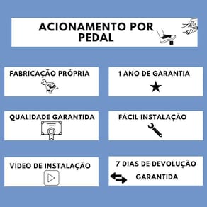 Pedal em aço inox escovado. 1 ano de , excelente durabilidade Informações técnicas: Dimensões da válvula 5,5cm x 7cm ; Pedal acionador em inox 12cm x 7cm x 3cm ; Cabo do acionador com 90cm; Entrada de água 1/2 macho e saída de água 1/2 fêmea ; Pressão de operação: vazão mínima de 7l/min com 0,2kgf/cm, vazão máxima de 40l/min com 8,0kgf/cm; Vida útil: mais de 800.000 acionamentos; Pedal: inox 304; Conduíte: inox 304; Cabo dentro do conduíte: inox 304; Válvula: latão. Temperatura máxima suportada: 60ºc Acionador de pedal para torneira. Pedal com instalação mais simples do mercado. Para acionar, basta pressionar com o pé sobre o pedal. Ao retirar o pé, o acionamento é interrompido. Evita a contaminação cruzada, principalmente o conoravírus 19 e a transmissão de doenças em ambientes hospitalares ou de saúde como clínicas médicas, clínicas odontológicas, centros cirúrgicos ou postos de saúde. Uso indicado para ambientes onde não é permitido o contato manual como restaurantes, consultórios, clínicas, hospitais e laboratórios. Em escolas ou refeitórios onde são servidas inúmeras refeições, uma torneira com acionamento pelo pé facilita o trabalho de quem prepara as refeições e também de quem limpa a cozinha. A preocupação com a higiene, com a saúde e com o meio ambiente são assuntos cada vez mais em evidência. Não usa energia elétrica, portanto, não há riscos de você ficar sem a torneira caso o serviço de eletricidade seja interrompido por algum motivo. O acionador de pedal mecânico evita o contato das mãos nas torneiras, evitando assim riscos de contaminação pois as válvulas são grandes transmissoras de vírus e bactérias. Esse modelo possui muitas vantagens, entre elas, impede a transmissão de doenças ao evitar a contaminação cruzada pelo contato com as mãos. Afinal, o acionamento é feito pelo pé. As mãos de quem utiliza a torneira ficam livres, facilitando o trabalho em diversos ambientes. Mais higiene, pois evita contato manual e contaminação cruzada. Proporciona economia de até 70% de água. Com a utilização de um acionador de pedal mecânico de torneira, as mãos de quem utiliza a torneira estão livres, facilitando o trabalho de quem usa a pia para lavar a mão, a louça e outros utensílios. Fabricante h2tec. Fácil instalação. Não acompanha bica. Fabricado em aço inox 304, resistente, não enferruja e não requer energia elétrica. Fácil para acionar. Altura do pedal mecânico é ergonômica, evita desconfortos na utilização no dia a dia. De fácil instalação e não precisa quebrar o chão. Você poderá utilizar a mesma torneira que já está no local, apenas retirando o dispositivo de dentro da torneira, assim ela será apenas passagem para a água. Com a válvula em latão, sua resistência e durabilidade são altas, com mais de 600.000 acionamentos. É um produto modular e, quando for necessário fazer sua manutenção, você trocará apenas o módulo com defeitos. É um produto 100% nacional, desenvolvido e produzido aqui no brasil. Valorize os produtos nacionais.