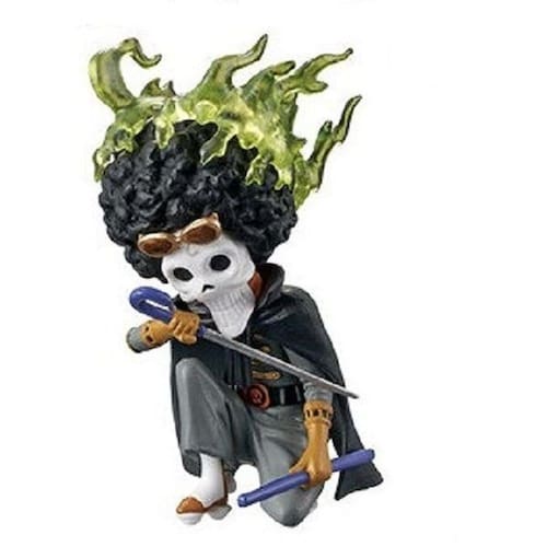 Descrição: Brook é o Músico dos Piratas do Chapéu de Palha. Ele é um esqueleto que os Chapéus de Palha encontraram a bordo de um navio fantasma depois de entrarem no Triângulo Florian. Ele é um usuário de Akuma no Mi que comeu a Yomi Yomi no Mi, o que o torna um pseudo-imortal por causa de seus poderes. Ele é o nono membro do Bando do Chapéu de Palha, e o oitavo a se juntar à tripulação de Luffy. Ele é também um dos dois Espadachins a bordo de seu atual navio, o outro sendo Zoro. Ele preenche o cargo do tão esperado músico que Luffy queria para sua tripulação desde que sua jornada começou. Ele tem uma recompensa de Bsymbol83,000,000. One Piece é um mangá escrito e ilustrado por Eiichiro Oda. A série conta a história do pirata Monkey D. Luffy, capitão da tripulação dos Piratas do Chapéu de palha e que pretende obter o maior tesouro do mundo, conhecido como "One Piece" e assim se tornar o próximo Rei dos Piratas.