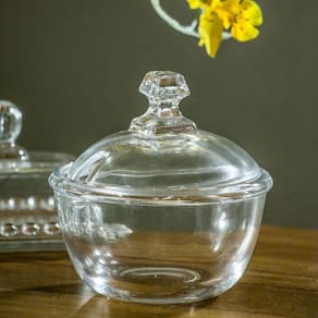 Esse açucareiro é feito de vidro transparente e na tampa tem uma fissura para acomodar uma colher. Ele é ideal para alojar o açúcar durante o serviço de mesa.