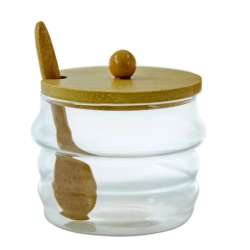 Açucareiro em vidro borossilicato com tampa e colher em bambu.