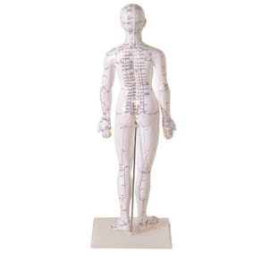 Modelo anatômico de corpo inteiro, feminino, reproduz em detalhes, todos os chacras e meridianos para estudo e aplicação de técnicas de acupuntura. Confeccionado em plástico emborrachado, montado sobre base e haste de metal cromado.