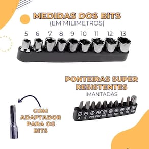 Kit cabo extensor flexível para parafusadeira + adaptador angular 105 O conjunto extensor é perfeito para realizar trabalhos de difícil alcance; o extensor pode ser utilizado em parafusadeira, furadeira ou chave catraca manual, ele é revestido em borracha, fazendo com que suas mãos fiquem seguras, pois ao acionar o gatilho ou girar a sua ferramenta manual, o eixo interno gira e aperta ou desaperta o parafuso escolhido, e para completar esse maravilhoso kit, você tem todos os tipos de pontas bits para acoplar ao seu extensor. Ele funciona auxiliando na realização de trabalhos em lugares apertados, possui facilidade para apertar ou desapertar parafusos em lugares de difícil acesso e pode ser em curva, proporcionando agilidade na execução do trabalho. Caracteristicas 10 Bits sendo eles: 1 adaptador 1/4 2 pontas fendas SI4/SI6 4 pontas philips PH1/PH2/PZ1/PZ2 3 pontas torx T25/T27/T30 9 Soquetes sendo eles: 5/6/7/8/9/10/11/12/13mm Itens Inclusos 1 Eixo extensor 24cm com 2 pontas de 1/4 1 Adaptador soquete 42mm 9 Soquetes 10 Bits 1 Adaptador Angular imantado 105 Magnético 1/4 do vendedor: 30 dias Marca: Não Informado