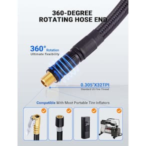 Adaptador de mangueira de inflador de pneu atualizado com extremidade rotativa de 360°, mangueira de enchimento de pneu de 53 cm com mandril de ar de travamento automático para conexão e liberação rápida, válvula Presta e agulha esférica para compressor de ar portátil de bomba de pneu ?Extremidade da mangueira rotativa de 360 graus?Mangueira de extensão de inflador de pneu LUMITECO com extremidade de mangueira giratória projetada para máxima flexibilidade, garantindo que você possa inflar com facilidade de qualquer ângulo. Chega de dificuldades para posicionar seu compressor de ar portátil, basta girar a extremidade da mangueira para ajustá-la à posição adequada para inflação. ?Rosca de conexão universal?Rosca fina de válvula schrader padrão para carros (0,305 "x32TPI) Compatível com a maioria dos infladores de pneus portáteis. Um adaptador schrader para válvula presta para bicicleta, motocicleta, enchimento de ar do carro. Também vem com ferramentas de inflador de agulha universal, tornando-as acessórios úteis para compressores, bombas de ar elétricas, também ideais para brinquedos infláveis, bolas esportivas, balão, anel de natação, etc. ?VÁLVULA DE SANGRADOR DE AR RÁPIDO?Este adaptador de mangueira de mandril de ar trava permite uma rápida esvaziamento de ar com uma pressão simples e suave, projetado para ser uma adição útil quando precisar liberar o ar do excesso de enchimento sem ter que remover a bomba sempre. Pressione o polegar para travar e um segundo para inflar ou esvaziar. ?Estrutura sólida e bloqueio seguro?Mangueira de borracha reforçada de nylon de alta qualidade, cabeça adaptadora de bomba de ar resistente e função de bloqueio de liberação rápida facilitam a conexão rápida a essas válvulas com espaço limitado e trava firmemente nas hastes da válvula no processo de inflação de ar. Esta mangueira de substituição de bomba de pneu oferece resistência e durabilidade para suportar o uso frequente. ?O que você receberá?Você receberá 1 mangueira de liberação rápida de ar de 55 cm, 1 adaptador de válvula Presta (tipo americano para francês), 1 adaptador de agulha esférica, 2 bicos cônicos. Sua ferramenta essencial de enchimento de pneus em situações de emergência e uso diário para encher rapidamente as mãos livres. - ?Extremidade da mangueira rotativa de 360 graus?Mangueira de extensão de inflador de pneu LUMITECO com extremidade de mangueira giratória projetada para máxima flexibilidade, garantindo que você possa inflar com facilidade de qualquer ângulo. Chega de dificuldades para posicionar seu compressor de ar portátil, basta girar a extremidade da mangueira para ajustá-la à posição adequada para inflação. - ?Rosca de conexão universal?Rosca fina de válvula schrader padrão para carros (0,305 "x32TPI) Compatível com a maioria dos infladores de pneus portáteis. Um adaptador schrader para válvula presta para bicicleta, motocicleta, enchimento de ar do carro. Também vem com ferramentas de inflador de agulha universal, tornando-as acessórios úteis para compressores, bombas de ar elétricas, também ideais para brinquedos infláveis, bolas esportivas, balão, anel de natação, etc. - ?VÁLVULA DE SANGRADOR DE AR RÁPIDO?Este adaptador de mangueira de mandril de ar trava permite uma rápida esvaziamento de ar com uma pressão simples e suave, projetado para ser uma adição útil quando precisar liberar o ar do excesso de enchimento sem ter que remover a bomba sempre. Pressione o polegar para travar e um segundo para inflar ou esvaziar. - ?Estrutura sólida e bloqueio seguro?Mangueira de borracha reforçada de nylon de alta qualidade, cabeça adaptadora de bomba de ar resistente e função de bloqueio de liberação rápida facilitam a conexão rápida a essas válvulas com espaço limitado e trava firmemente nas hastes da válvula no processo de inflação de ar. Esta mangueira de substituição de bomba de pneu oferece resistência e durabilidade para suportar o uso frequente. - ?O que você receberá?Você receberá 1 mangueira de liberação rápida de ar de 55 cm, 1 adaptador de válvula Presta (tipo americano para francês), 1 adaptador de agulha esférica, 2 bicos cônicos. Sua ferramenta essencial de enchimento de pneus em situações de emergência e uso diário para encher rapidamente as mãos livres. Compre com confiança, sempre garantimos todos os nossos itens!