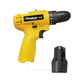 A Parafusadeira elétrica a bateria Titanium possui mandril de 3/8" pol. (10mm) com aperto rápido e ajuste de torque/perfuração, regulagens com posição para perfuração e botão de sentido horário e anti-horário de rotação.