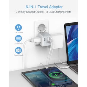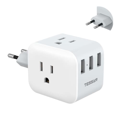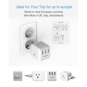 OBSERVE 1. Este adaptador NÃO converte tensão. 2. Não funcionará somente com itens de 110 V/120 V. 3. Certifique-se de que a tensão do seu dispositivo seja de 100V-250V antes de usar. Adaptador de viagem TIPO C com tensão de entrada USB: AC 100V-250V 50/60Hz Carga máxima: 10A Potência nominal máxima: 2500W-10A máx, 250V ~ Saída por porta USB: 2,4A MAX por porta Saída total USB: 5V DC 3A MAX, 15W - Conversor de tomadas europeias tipo C: compatível com a maioria dos países do EURO, como França, Alemanha, Itália, Grécia, Islândia, Suíça, Áustria, Espanha, Dinamarca, Hungria, Portugal, Polônia, Holanda, Bélgica, Croácia, Bielorrússia, Finlândia, Turquia, etc (NOTA: NÃO inclui Reino Unido, Irlanda, Escócia) - Conversor de energia 6 em 1 da UE Adaptador: estes adaptadores para tomadas europeias aceitam o plugue de pino plano padrão norte-americano de 2 ou 3 pinos, com capacidade máxima de até 2500 watts (máx. 250 volts, 10 A); 3 portas USB podem carregar até 2,4 A, ideais para celular, tablet etc.;, permitindo carregar 6 dispositivos simultaneamente - Ultra leve e compacto: este adaptador de alimentação internacional é um acessório de viagem leve e compacto, adequado para hotel ou navio de cruzeiro durante sua viagem - Design de cubo: 3 saídas amplas e design de cubo compacto, evitam o bloqueio umas das outras, mesmo de plugues grandes. E a luz indicadora permite que você saiba que a alimentação está ligada/desligada - NÃO é um conversor de voltagem: este adaptador funciona com produtos eletrônicos de grande tensão (100V-250V). Mas NÃO é possível converter tensão de 220V para 110V ou vice-versa. Se o seu dispositivo funciona SOMENTE com tensão de 110 V/120 V, como secador de cabelo, modelador, alisador, etc., você pode precisar de um conversor de voltagem para sua viagem