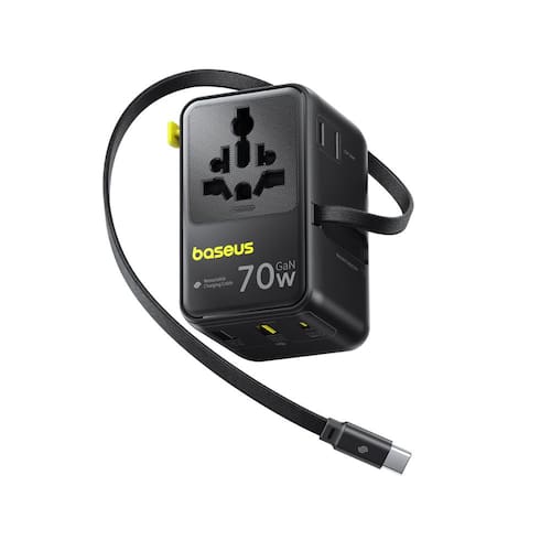 - [Cabo retrátil USB-C de 70 W embutido] - O adaptador de plugue internacional Baseus pode fornecer até 70 W no máximo com o cabo USB-C retrátil embutido, que foi trançado com náilon para suportar o desgaste no uso diário. Basta puxar para carregar em qualquer lugar, a qualquer hora, sem necessidade de carregar cabos extras.
