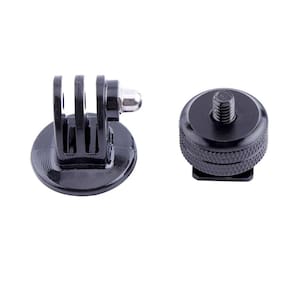 Junto dele, um adaptador de 3 pinos (padrão GoPro) de plástico está incluso para que você consiga montar a sua câmera de ação. Sua parte inferior possui uma rosca de 1/4"-20 para que seja fixado à sapata de alumínio. E ainda conta com duas placa de aço inoxidável para serem instaladas junto da sapata, funcionando como uma espécie de arruela para manter o suporte seguro e firme.