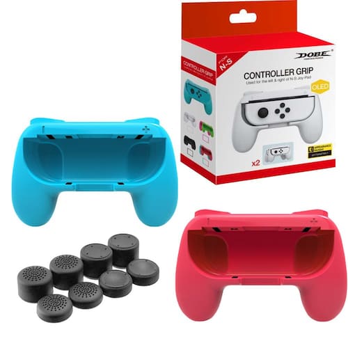 Kit com: - 2 Suporte para Joy-con cor azul/vermelha DOBE - 8 grips alongadores para analógicos em borracha