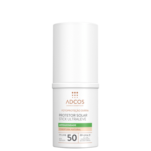Protetor solar facial para peles mistas e oleosas. Adcos Fotoproteção Diária Stick Ultraleve FPS 50 oferece controle da oleosidade, reduz poros e protege do sol.