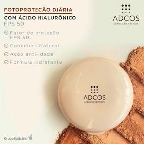 Protetor Solar Pó Compacto Adcos Fotoproteção Diária com Ácido Hialurônico FPS50 é um filtro solar 100% físico, que tonaliza a pele, disfarça imperfeições e confere efeito matte. Protege dos raios UVA, UVB, infravermelho e luz visível, resistente à água, composto 100% de filtros minerais com 5 tonalidades diferentes e uma versão translúcida.