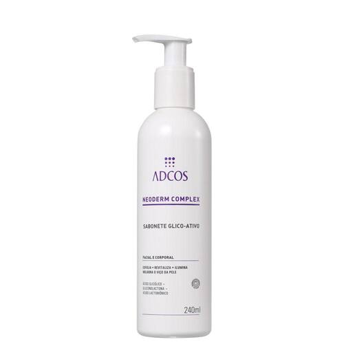 Sabonete líquido facial e corporal para peles espessas e desvitalizadas. Multifuncional, Adcos Neoderm Complex Sabonete Glico-Ativo higieniza, ilumina, esfolia e renova a pele. Deixa sua textura mais uniforme e impede a obstrução dos poros.