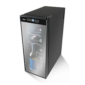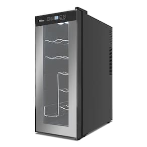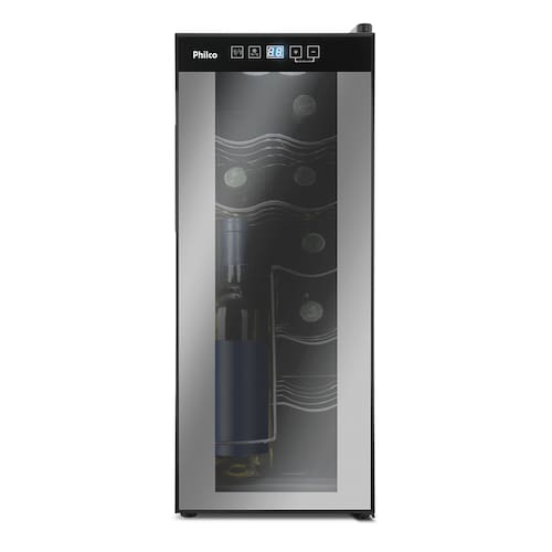 Adega Philco PAD12E para 12 garrafas, com sistema de refrigeração termoelétrica, controle digital de temperatura (10°C a 18°C), prateleiras cromadas deslizantes e reguláveis, iluminação LED interna e pés niveladores ajustáveis.Capacidade total de garrafas
