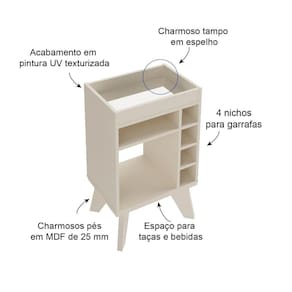 A Adega Bar Retrô com Espelho Multimóveis CR50033 é produzida em MDP (15mm) com acabamento em pintura UV, o que garante maior durabilidade e facilidade na limpeza. Possui prateleira (suporta 2kg) e espaçamento na parte inferior para acomodar demais bebidas e taças. Prática e cheia de estilo, se destaca em qualquer tipo de ambiente. Conta também com porta-garrafas e espelho (3mm) no tampo, dando destaque ao móvel. Os pés em MDF (25mm), dão um charme especial, deixando com um visual leve e moderno. Além de ser um item que traz praticidade na hora de preparar drinks e servir as visitas, esta adega é muito estilosa e deixa sua casa única e aconchegante.