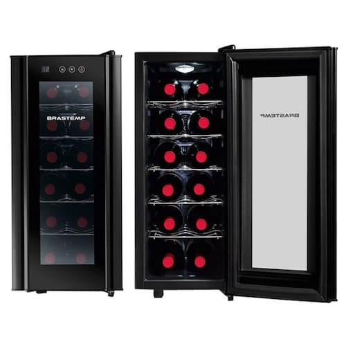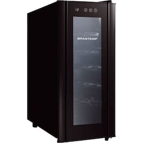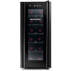 Adega Brastemp All Black com capacidade para 12 garrafas, controle eletrônico Touch Sensor, display de temperatura e iluminação interna por LED. Sistema de refrigeração estável.Capacidade total de garrafas