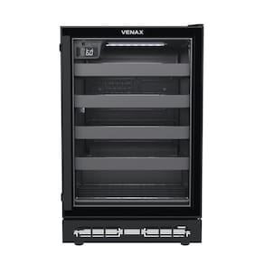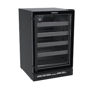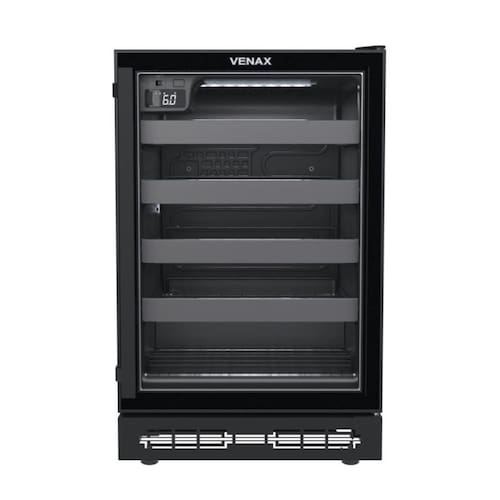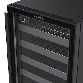 Adega Venax Cave In 100, capacidade para 24 garrafas, controlador digital de temperatura (6°C a 20°C), iluminação interna LED, porta de vidro duplo LOW-E, sistema de refrigeração por compressor, e gabinete com pintura eletrostática.Capacidade total de garrafas