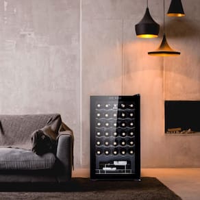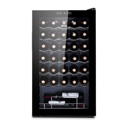Adega climatizada EOS com capacidade para 34 garrafas, refrigeração por compressor com gás ecológico, painel touch screen, controle de temperatura de 6°C a 18°C, iluminação interna em LED, baixo nível de ruído e sistema antivibração.Capacidade total de garrafas