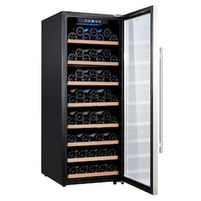 Adega climatizada de embutir EOS Premium com compressor, capacidade para 85 garrafas, controle eletrônico de temperatura (5°C a 18°C), porta de vidro Double Glass, prateleiras de madeira, iluminação interna de LED, baixo nível de ruído e sistema antivibração.Capacidade total de garrafas