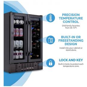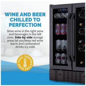 TODAS AS SUAS BEBIDAS FAVORITAS EM UM LUGAR Esta geladeira de bebidas de zona dupla possui duas áreas de zenamento lado a lado, permitindo que você mantenha vinho tinto quente e bebidas gaseificadas geladas. As portas de vidro com painéis duplos oferecem excelente isolamento e podem ser trancadas para maior segurança. Os LEDs azuis iluminam o interior para um visual moderno.
