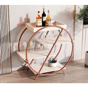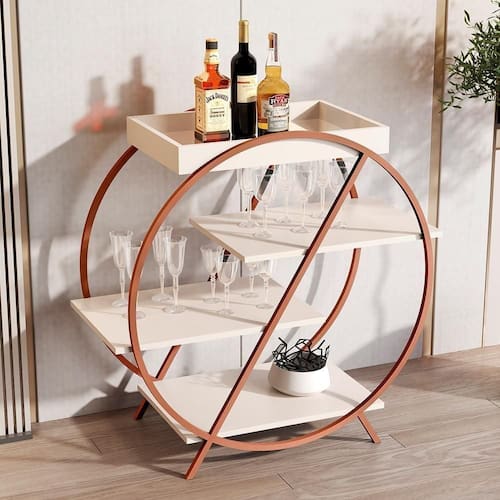 Contém quatro prateleiras para facilitar o armazenamento de garrafas, taças e objetos decorativos, possui espelho na base da bandeja.