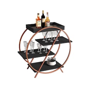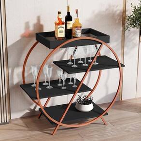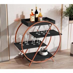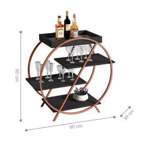 Contém quatro prateleiras para facilitar o armazenamento de garrafas, taças e objetos decorativos, possui espelho na base da bandeja.