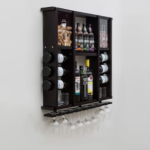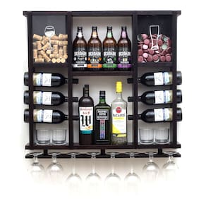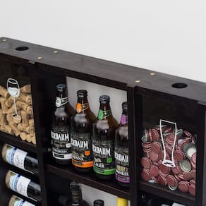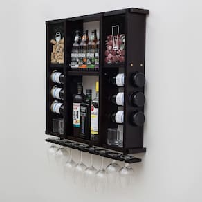 Adega Barzinho com Porta Rolhas, Porta Tampinhas e Porta Taças Cor Nogueira Preta Fabricada em Madeira Maciça, Certificada e Sustentável; Ideal para Cervejas Artesanais, Vinhos, Whiskeys e Cachaças; Exclusivos compartimentos Porta Rolhas e Porta Tampinhas com Vidro Frontal Adesivado e Fundo Removível; Comporta até 13 Garrafas; Suporte para 8 Taças; Fotos Reais do Produto; Produto Criado e Desenvolvido por nossa empresa; Dimensões do Produto: 75cm de Altura, 80cm de comprimento e 12cm de Largura; Acompanha Kit de Fixação; O produto é enviado MONTADO. Garrafas e Taças não Acompanham o Produto Marca: Delenha decorações em madeira Ean: 7897072197072