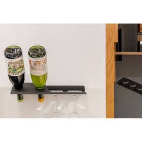 organize foi desenhada para acomodar duas garrafas e duas taças de vinhos e espumantes dos mais variados padrões. É perfeita para quem dispõe de pouco espaço e preza por praticidade e organização, além de ser ideal para presentear os admiradores dessas bebidas. O ângulo de 30° permite o armazenamento de forma correta das bebidas, mantendo a rolha úmida e evitando a passagem de oxigênio que poderá estragar a bebida. A instalação pode ser feita em paredes como item decorativo ou dentro de armários e cristaleiras. Acabamento Pintando Preto.