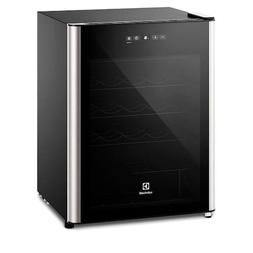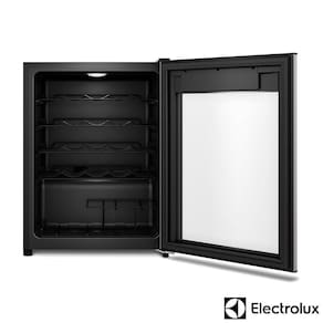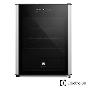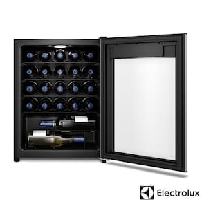 Adega Electrolux para 24 garrafas com porta de vidro duplo, controle digital de temperatura, luz interna de LED, e painel eletrônico. Opera entre 5°C e 18°C.Capacidade total de garrafas