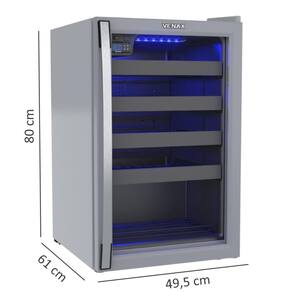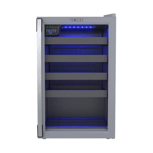 Tipo: Adega Marca: Venax Controlador de temperatura: Digital, regulável de 6C a 20C Sistema de refrigeração: Compressor Gás refrigerante: R134a Iluminação interna: Led azul Porta: Vidro duplo (LOW-E) Puxador da porta: Alumínio Abertura da porta: Esquerda para direita Trava de abastecimento: Não Aquecimento da porta: Não Prateleiras: 4 Deslizantes e 1 fixa Evaporador: Sem ar forçado Gabinete interno: PSAI Gabinete externo: Aço revestido com pintura eletrostática Degelo: Natural Recipiente de degelo: Sim Dreno: Traseiro Pés: Frontais reguláveis e traseiros com rolete Capacidade de armazenamento: 24 Garrafas, diâmetro máximo 90mm Medidas do produto: Altura 79cm - Largura 49,5cm - Profundidade 61cm
