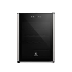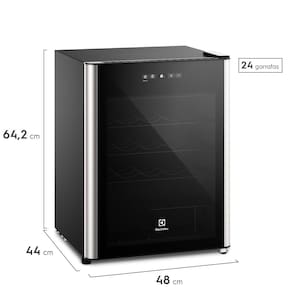 Adega climatizada com capacidade para 24 garrafas, 1 porta com vidro temperado, painel digital, 4 prateleiras corrediças e removíveis, iluminação LED, sistema de refrigeração por compressor, instalação freestanding.Capacidade total de garrafas