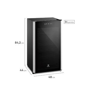 Adega Electrolux WSF34 para 34 garrafas com painel digital, controle de temperatura entre 5°C e 18°C, 6 prateleiras, iluminação interna de LED e porta com vidro duplo.Capacidade total de garrafas