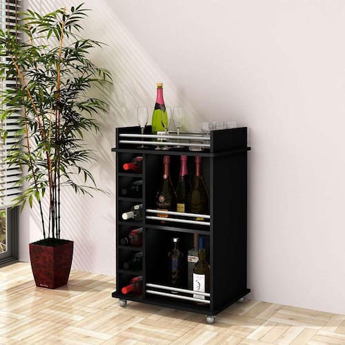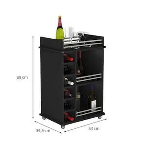 que tal a adega maren? apreciadores de boas bebidas precisam ter espaço para guardá-las, não é mesmo? com a adega maren, você poderá utilizar os 6 nichos, a prateleira e o espaço de tampo para acomodar seus rótulos favoritos, além de acessórios como balde de gelo, saca-rolhas, taças e outros utensílios. com design clean e moderno, a peça destaca a cor preta e as barras prateadas, assim fica fácil combiná-la com o restante dos móveis na casa. ah, ela tem rodízios nos pés para você conseguir levar a festa para qualquer cômodo :)