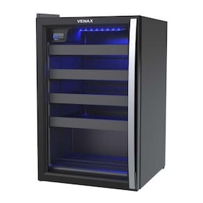 Adega com controle digital de temperatura, iluminação LED azul, porta de vidro duplo (LOW-E), puxador de alumínio, degelo natural, 4 prateleiras deslizantes e 1 fixa, sistema de refrigeração por compressor, pés frontais reguláveis e traseiros com rolete.Capacidade total de garrafas