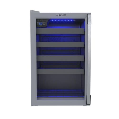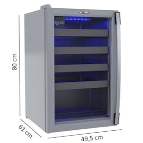 Adega Venax PiuBella Cave 100 para 24 garrafas com controlador digital de temperatura (6°C a 20°C), iluminação interna LED azul, porta de vidro duplo (LOW-E), 4 prateleiras deslizantes, 1 fixa e sistema de refrigeração por compressor.Capacidade total de garrafas