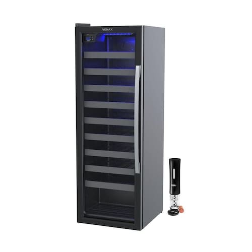 Adega Piubella 200 Venax para 50 garrafas, 200L, porta invertida, controle digital de temperatura (6C a 20C), iluminação interna LED azul, prateleiras deslizantes, sistema de refrigeração por compressor e porta de vidro duplo (LOW-E). Inclui abridor de vinho elétrico EOS.Capacidade total de garrafas
