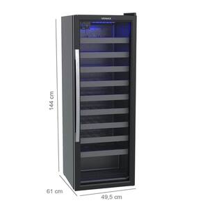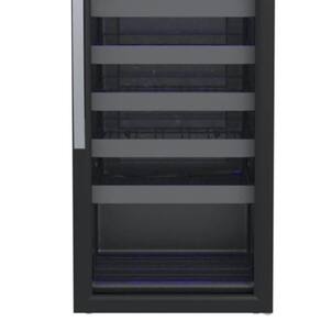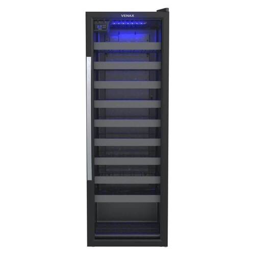 Adega com controle digital de temperatura, iluminação interna em LED azul, porta de vidro duplo (LOW-E), puxador de alumínio, degelo natural, sistema de refrigeração por compressor, pés frontais reguláveis e traseiros com rolete.Capacidade total de garrafas