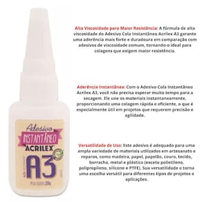 O Adesivo Cola Instantâneo Acrilex A3 é a escolha perfeita para quem busca qualidade e eficiência em colagens rápidas. Com sua fórmula de alta viscosidade, ele proporciona uma aderência forte e duradoura em uma variedade de materiais, como madeira, papel, papelão, couro, tecido, borracha, metal e plástico (exceto polietileno, polipropileno, silicone e PTFE).