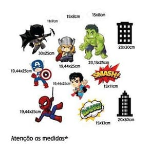 Adesivo de box de banheiro mini super heróis Mini heróis: transparente Atenção as medidas Os adesivos decorativos são produzidos com material de alta qualidade. As imagens anunciadas são ilustrativas Tamanho do adesivo O adesivo da foto parece grande Então atenção: O modelo que está na foto não se refere ao tamanho do adesivo anunciado. deixamos o adesivo grande para que você possa visualizar melhor o produto que está comprando Material Vinil adesivo. É só destacar e colar Nossos adesivos são específicos para superfícies lisas, por isso se adequam a paredes, vidros, madeiras e demais superfícies sem texturas. Importante lembrar de conferir que o local para aplicação está devidamente limpo, sem poeiras, gorduras ou demais resíduos. Todos os nossos produtos são enviados com manual de instruções e dicas para aplicação. As imagens anunciadas são ilustrativas Pode haver variações na cor de acordo com as configurações do seu monitor. Confira todas as informações como medidas e quantidade na descrição do produto. Marca: Lojinha Da Luc
