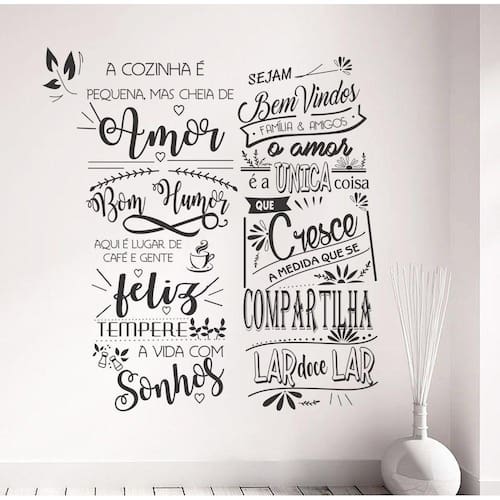 ADESIVO DECORATIVO DE PAREDE Adesivo Decorativo de Parede Combo Frases "Sejam Bem Vindos" e "A Cozinha" Tamanho Alt.xComp. FRASE 1: 120x47 cmFRASE 2: 102 x47 cm DescriçãoDecore sua casa: ideal para sala, quarto, cozinha, moveis, escritório, vidros de box, janelas, portas, etc.Ótima qualidade: Recortado eletronicamente em máquina de última geração.Ótimo acabamento: produzido em vinil de fácil aplicação, e pode ser removido a qualquer momento sem prejudicar a pintura ou a superfície aplicada Dica de Aplicação : Limpe o local com um pano úmido, certifique-se de retirar todo o pó da parede para melhor fixação do produto. Enviamos manual e temos video que ensina aplicar, de facil aplicação